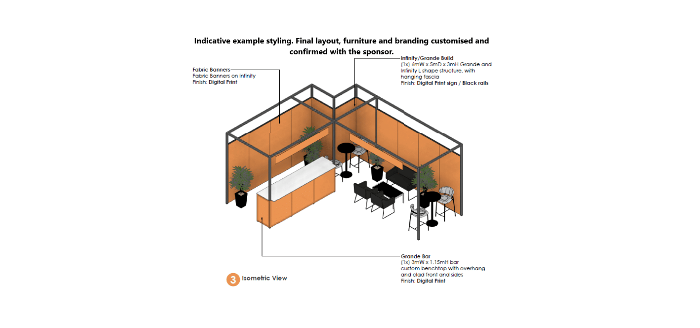 - Your choice of furniture, AV, or signage up to a certain value. (Value to be confirmed by organiser with additional items at the sponsor’s expense)